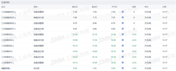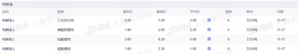 发布时间:2025-07-15 | 发布者: 东东工作室 | 浏览次数: 次证券之星新能源车行业周报:据上海有色网,截止11月17日,电池级碳酸锂14.05-15.35万元/吨,均价14.7万元/吨,环比上一工作日下滑0.05万元/吨;工业级碳酸锂13.55-14.3万元/吨,均价13.93万元/吨,环比上一工作日下滑0.07万元/吨。近期上游盐厂依然挺价出售散单,但整体成交寥寥,现货成交价格延续下行趋势。此外,近期部分正极端企业出售碳酸锂原料库存,叠加近期锂盐集中到港,均使锂盐供应端增量明显,市场短期以降低库存为主。