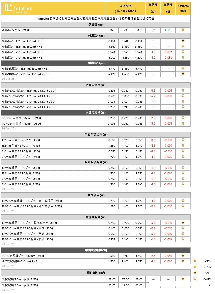 硅片与电池片间的博弈持续,其中以G12尺寸更为激烈,预期该尺寸下周仍有跌价机会,尽管硅片厂家仍以企稳价格的销售策略维持出货,短期持续面临上下游的价格分化夹击,与后续针对十一长假前的屯备货需求也将影响价格走势变化。