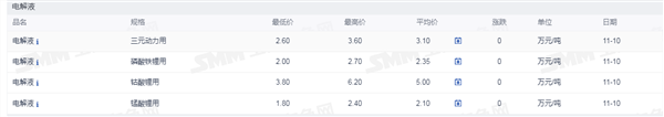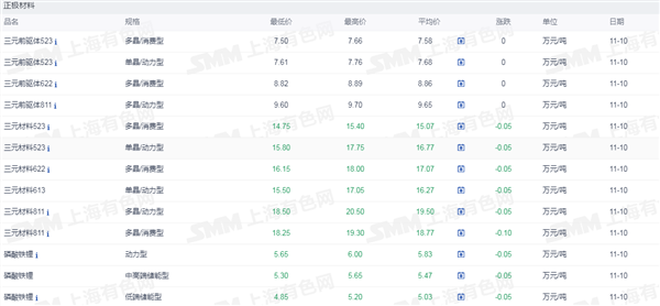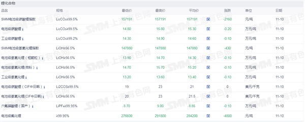 发布时间:2025-09-01 | 发布者: 东东工作室 | 浏览次数: 次证券之星新能源车行业周报:据上海有色网,截止11月10日,电池级碳酸锂14.8-15.8万元/吨,均价15.3万元/吨,环比上一工作日下滑0.2万元/吨;工业级碳酸锂14.3-14.9万元/吨,均价14.6万元/吨,环比上一工作日下滑0.1万元/吨。上游锂盐企业更多以长单出售为主,挺价心态依旧,但个别锂盐企业随行就市小幅下调出售价格,下游正极材料企业出于降本增效策略,其散单拿货情绪也依旧低迷,近期碳酸锂现货市场成交价格仍呈现下行趋势。