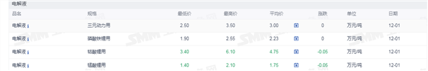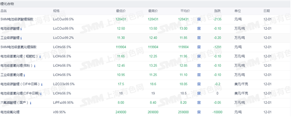发布时间:2025-09-01 | 发布者: 东东工作室 | 浏览次数: 次证券之星新能源车行业周报:据上海有色网,截止12月1日,电池级碳酸锂12.50-13.50万元/吨,均价13.00万元/吨,环比上一工作日下滑0.10万元/吨;工业级碳酸锂11.30-12.40万元/吨,均价11.85万元/吨,环比上一工作日下滑0.20万元/吨。供应端,近期部分上游大厂开始逐步放出前期储备库存,锂盐市场流通有所增量,但当前下游采买需求依旧疲软,供强需弱之下,市场看跌情绪依旧浓重,价格承压下行。