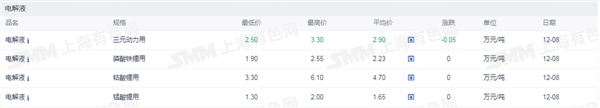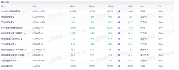 发布时间:2025-09-01 | 发布者: 东东工作室 | 浏览次数: 次证券之星新能源车行业周报:据上海有色网,截止12月8日,电池级碳酸锂11.2-12.5万元/吨,均价11.85万元/吨,环比上一工作日下滑0.2万元/吨;工业级碳酸锂10.15-10.9万元/吨,均价10.53万元/吨,环比上一工作日下滑0.17万元/吨。12月8日市场中锂盐企业的出货情绪抬升,个别锂盐企业和正极材料以11.2万元/吨价格成交较多的电池级碳酸锂,而盐湖企业和回收锂盐企业观望情绪抬升,并无明显出货打算。近期正极材料企业询价和拿货意愿更为积极,但由于贸易企业盘面套保难以平仓而限制其销售碳酸锂现货,正极材料更多偏向于向锂盐企业采购。但目前正极材料企业反馈其订单无明显增量迹象,其在进行采购并补充碳酸锂原料库存后,对于碳酸锂的采购或也难有持续大幅放量的情况出现。