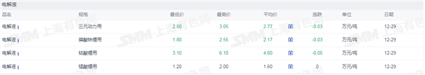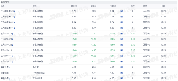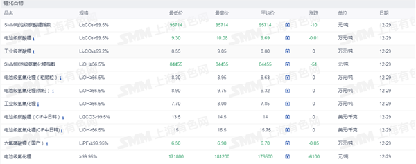 发布时间:2025-09-01 | 发布者: 东东工作室 | 浏览次数: 次证券之星新能源车行业周报:据上海有色网,截止12月29日,电池级碳酸锂9.3-10.08万元/吨,均价9.69万元/吨,环比上一工作日下滑0.01万元/吨;工业级碳酸锂8.55-9.05万元/吨,均价8.80万元/吨,环比上一工作日持平。临近年末,市场成交依旧维持清淡局面。当前贸易商因近期期现货价差扩大,进行持续期现货套利,对锂盐端采买需求小幅增加,而部分盐厂在期货价格相对较高的情况下,交仓意愿亦有所增强,供应端挺价情绪渐浓,市场维持弱稳局面。