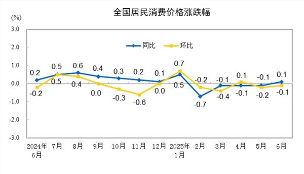 2025年6月份,全国居民消费价格同比上涨0.1%。其中,城市上涨0.1%,农村下降0.2%;食品价格下降0.3%,非食品价格上涨0.1%;消费品价格下降0.2%,服务价格上涨0.5%。上半年,全国居民消费价格比上年同期下降0.1%。