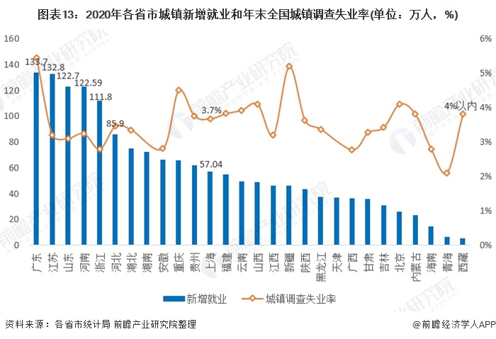 就业是经济的“晴雨表”,社会的“稳定器”,世界各国政府均把就业放在突出位置。2020年受疫情影响,全国新增就业有所下降为1186万人,少增166万人。其中广东、江苏、山东、河南、浙江等人口或经济大省新增就业均超百万。