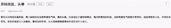 还有人表示,“家住长沙雨花区嘉和城,晚上闻到类似油漆刺激性气味,熏的头痛,比亚迪位于嘉和城南边,每当吹南风的时候,这种刺激性气味就异常浓烈,周围特别多小区,学校也非常多,很多好朋友大人流鼻血。要求及时处理,让大家能健健康康地生活在这片土地上。”