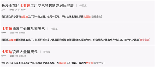 此外,在问政湖南的官网上,也有不少关于比亚迪排放废气的留言举报。