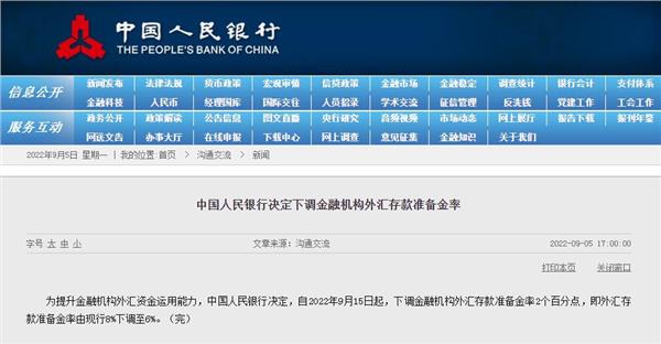 发布时间:2025-08-31 | 发布者: 东东工作室 | 浏览次数: 次据央行网站消息,为提升金融机构外汇资金运用能力,中国人民银行决定,自2022年9月15日起,下调金融机构外汇存款准备金率2个百分点,即外汇存款准备金率由现行8%下调至6%。