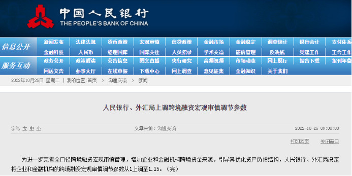 发布时间:2025-08-31 | 发布者: 东东工作室 | 浏览次数: 次10月25日,人民银行发布公告称,为进一步完善全口径跨境融资宏观审慎管理,增加企业和金融机构跨境资金来源,引导其优化资产负债结构,人民银行、外汇局决定将企业和金融机构的跨境融资宏观审慎调节参数从1上调至1.25。