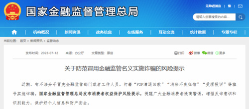 7月12日上午,国家金融监督管理总局发布关于防范冒用金融监管名义实施诈骗的风险提示,提醒广大金融消费者提高警惕,增强反诈意识和识别能力。