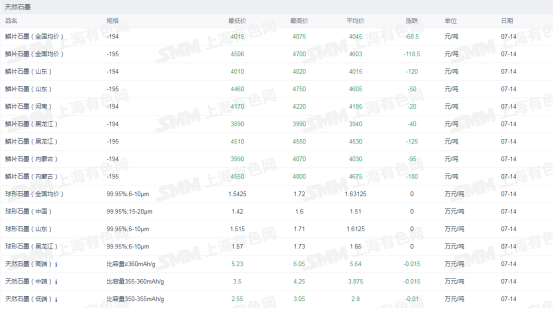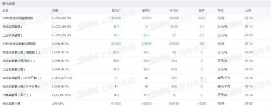 根据上海有色网数据,截至7月13日,电池级碳酸锂均价30.45万元/吨,工业级碳酸锂均价29.1万元/吨;电池级氢氧化锂(56.5%国产粗颗粒)均价28万元/吨,工业级氢氧化锂均价25.9万元/吨。三元材料方面,523多晶、523单晶、622多晶、811多晶(动力型)均价分别报每吨22.5,24,24.45,27.25万元。