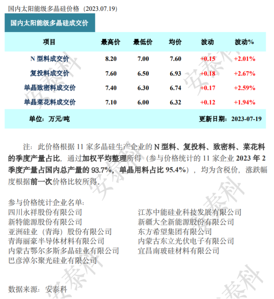 发布时间:2025-09-01 | 发布者: 东东工作室 | 浏览次数: 次证券之星光伏行业周报:中国有色金属工业协会硅业分会数据显示,本周硅料库存消化明显,多晶硅价格小幅上涨。浙商证券最新观点指出,HJT电池重大突破临近,预计2023年逐步实现盈利,2024年有望引来产业化大年。宏观方面,国家能源局数据显示,今年上半年我国可再生能源发电总装机突破13亿千瓦,其中太阳能发电装机4.71亿千瓦。企业方面,阿特斯7月19日公告显示,确定投资建设呼和浩特阿特斯电子材料科技有限公司年产20GW单晶拉棒、40GW单晶坩埚项目以及年产10GW切片+10GW电池+5GW组件+5GW新材料项目,预计投资金额分别为80亿元以及60亿元。