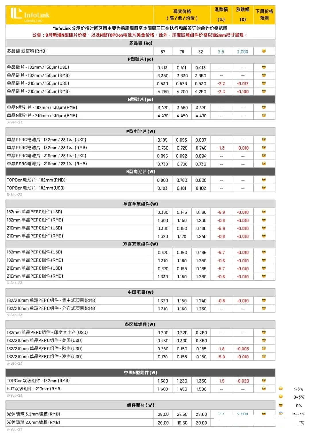 展望后势,在硅料价格的涨势中,预期下周硅片价格尚可维持当前水平,后续将视硅料的涨价幅度、以及头部厂家的稼动水平滚动变化。