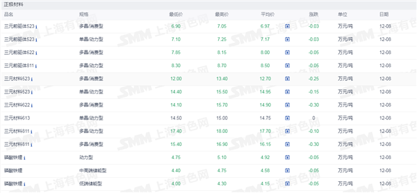 发布时间:2025-09-01 | 发布者: 东东工作室 | 浏览次数: 次证券之星新能源车行业周报:据上海有色网,截止12月8日,电池级碳酸锂11.2-12.5万元/吨,均价11.85万元/吨,环比上一工作日下滑0.2万元/吨;工业级碳酸锂10.15-10.9万元/吨,均价10.53万元/吨,环比上一工作日下滑0.17万元/吨。12月8日市场中锂盐企业的出货情绪抬升,个别锂盐企业和正极材料以11.2万元/吨价格成交较多的电池级碳酸锂,而盐湖企业和回收锂盐企业观望情绪抬升,并无明显出货打算。近期正极材料企业询价和拿货意愿更为积极,但由于贸易企业盘面套保难以平仓而限制其销售碳酸锂现货,正极材料更多偏向于向锂盐企业采购。但目前正极材料企业反馈其订单无明显增量迹象,其在进行采购并补充碳酸锂原料库存后,对于碳酸锂的采购或也难有持续大幅放量的情况出现。
