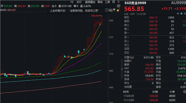 国内方面,行情数据显示,上海黄金交易所Au99.99合约今天上午最高报价已达566.9元/克,再创历史新高。