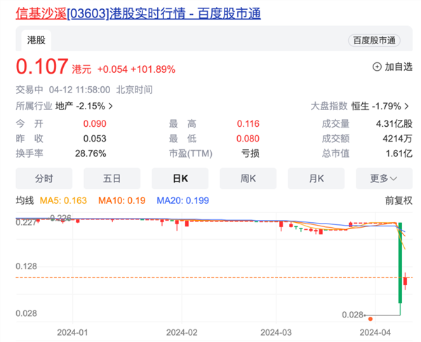 港股大幅波动股中,信基沙溪今天上午复牌后暴涨,盘中涨幅一度高达118.87%。