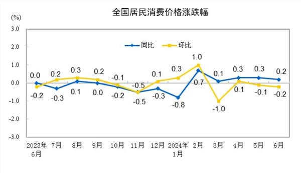 2024年6月份,全国居民消费价格同比上涨0.2%。其中,城市上涨0.2%,农村上涨0.4%;食品价格下降2.1%,非食品价格上涨0.8%;消费品价格下降0.1%,服务价格上涨0.7%。1—6月平均,全国居民消费价格比上年同期上涨0.1%。