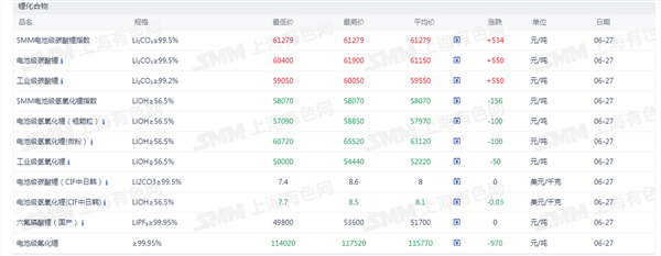 发布时间:2025-11-17 | 发布者: 东东工作室 | 浏览次数: 次证券之星新能源车行业周报:据上海有色网,截止6月27日,电池级碳酸锂6.04-6.19万元/吨,均价6.115万元/吨,环比上一工作日上涨550元/吨;工业级碳酸锂5.905-6.005万元/吨,均价5.955万元/吨,环比上一工作日上涨550元/吨,碳酸锂现货成交价格重心呈现震荡上行。当前碳酸锂市场仍延续供大于求的基本格局,供需矛盾依然突出。从供应端看,市场可流通货源充足,库存压力尚未得到有效缓解。近期碳酸锂价格的阶段性回升主要受宏观及市场情绪等外部因素驱动,而非基本面改善所致。需求侧方面,下游正极材料企业仍保持审慎的采购策略,以刚性需求采购为主,尚未出现明显的补库意愿,市场整体观望情绪浓厚。在此市场环境下,下游材料企业更倾向于通过长协加量的方式锁定采购成本,以确保原料供应的稳定性。