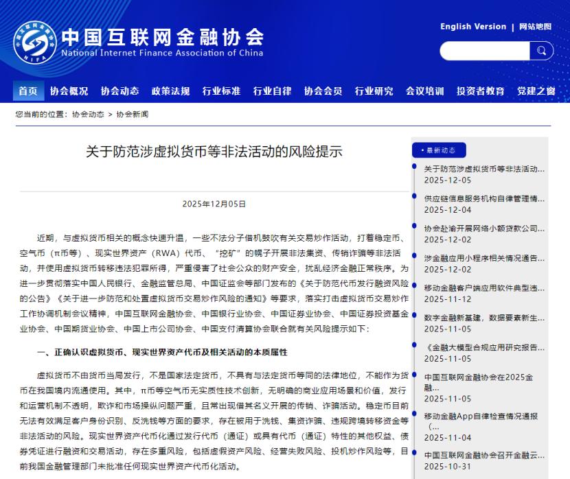 发布时间:2025-12-14 | 发布者: 东东工作室 | 浏览次数: 次12月5日,中国互联网金融协会、中国银行业协会、中国证券业协会、中国证券投资基金业协会、中国期货业协会、中国上市公司协会、中国支付清算协会等七家协会联合发布《关于防范涉虚拟货币等非法活动的风险提示》(以下简称《提示》)。《提示》特别提到,虚拟货币领域已成为传销、非法集资等非法活动的高发区,社会公众需高度警惕。