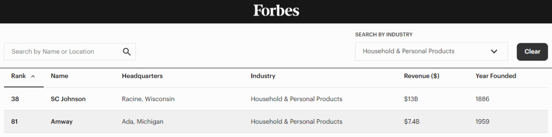 安利还成为了在榜单中仅有的两家“家庭和个人产品”类企业之一,另外一家是大名鼎鼎的日化巨头庄臣(SC Johnson),庄臣以130亿美元的业绩排名38位。
