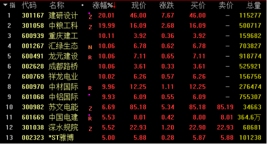 发布时间:2025-11-16 | 发布者: 东东工作室 | 浏览次数: 次今日基建板块大幅走高,截止发稿,建研设计、重庆建工、龙元建设、成都路桥、中材国际、中铝国际涨停;中国电建、深水规院等个股涨幅超5%。